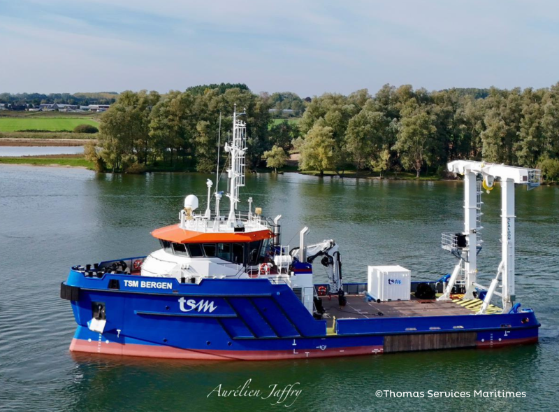 Arrivé à Brest début mars en provenance de Dieppe, le TSM Bergen, dernier navire acquis par Thomas Services Maritimes, a rapidement repris la mer pour rejoindre un nouveau chantier au large de Bayonne.